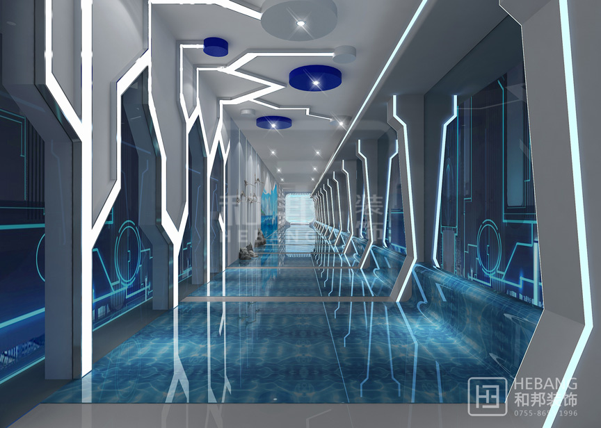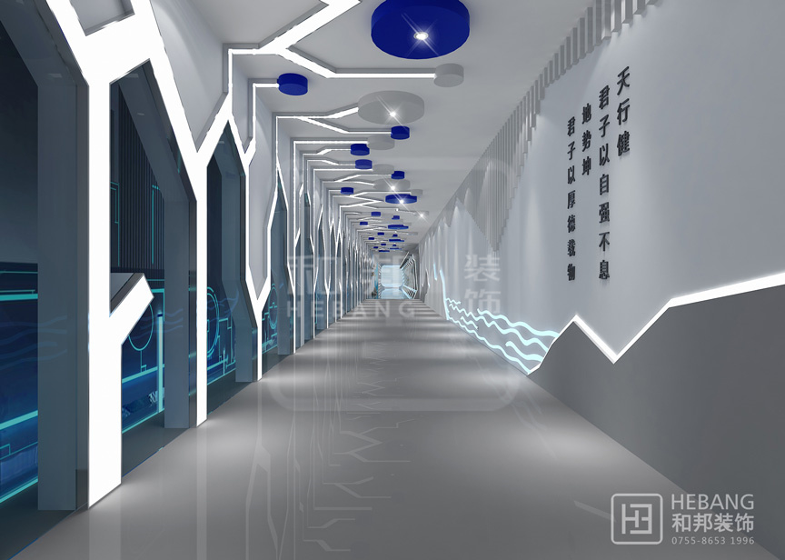| 設(shè)計(jì)說明 | 藍(lán)色貫穿于整個(gè)設(shè)計(jì)前后,讓人感覺干凈整潔。墻壁飾有的古代名言警句以及極富現(xiàn)代科技感的線條,行走在其中,像是穿越了古今,讓人流連往返。 | ||||