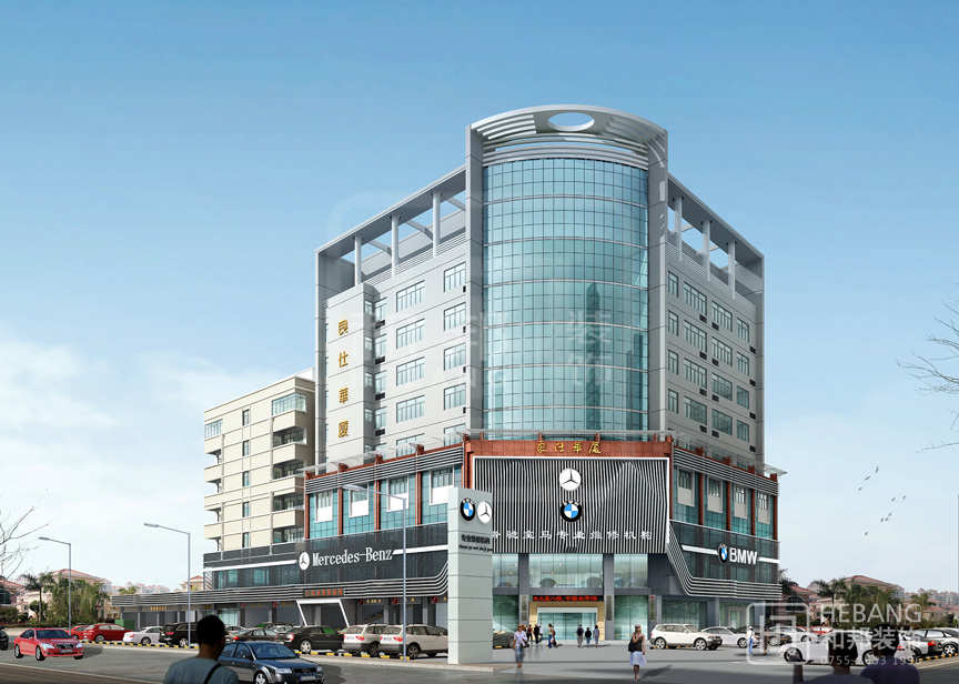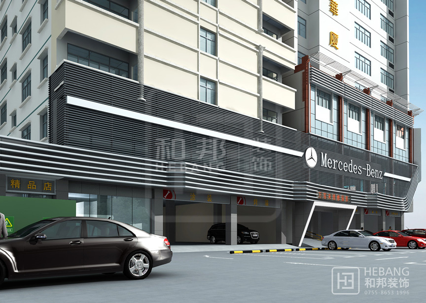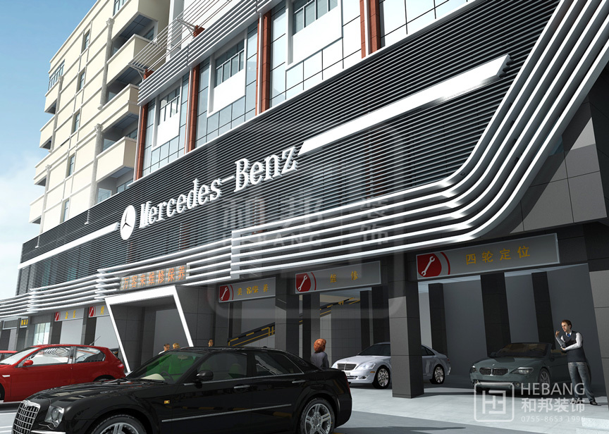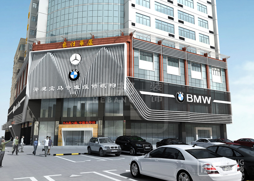 設(shè)計(jì)說(shuō)明高端大氣的現(xiàn)代設(shè)計(jì):以汽車頭部為原型設(shè)計(jì)的門(mén)頭,大膽新穎,創(chuàng)新十足。分區(qū)設(shè)計(jì),奔馳與寶馬維修店分布兩旁,使整個(gè)維修機(jī)構(gòu)美觀大方。