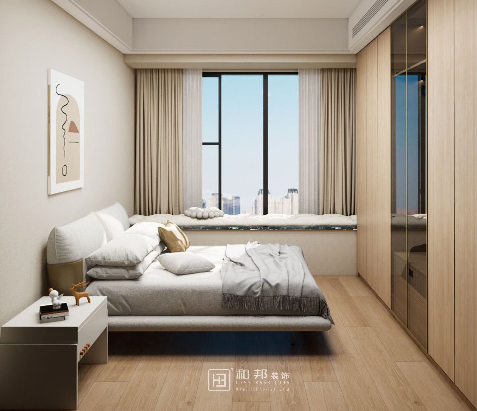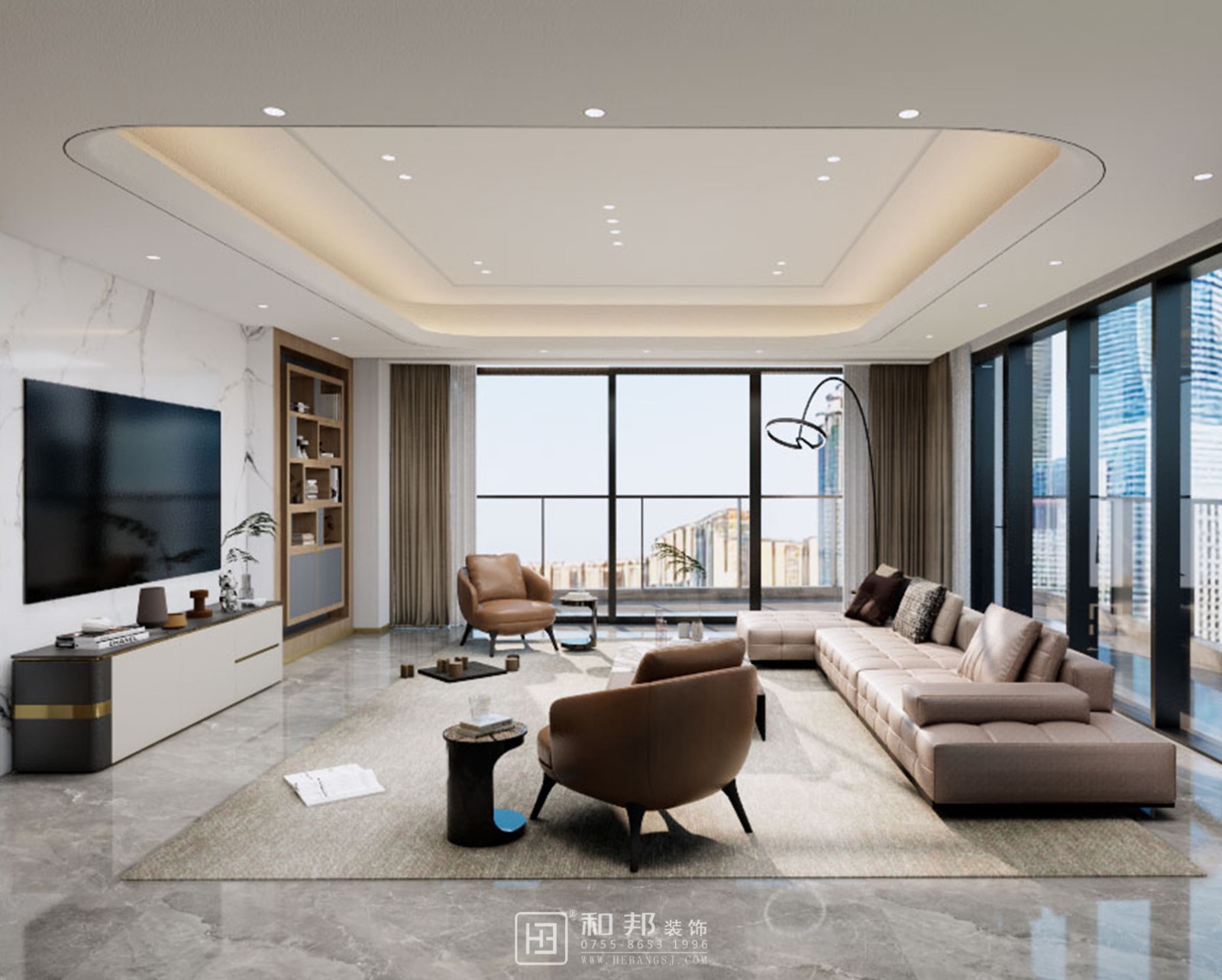 這是現代簡約風格的室內設計,以簡潔線條、中性色調為主,搭配大窗戶引入自然光線,營造開闊、舒適且具時尚感的空間,體現簡約大氣的居住氛圍 。